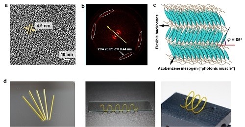 通过向自然界“取经”,团队留心到,生物动脉血管管壁因其层状结构的存在,可承受高达2000毫米汞柱的压强,可谓异常坚韧。受此启发,仿生设计一种全新结构的线型液晶高分子材料最终成为问题的解决之道。通过开环易位聚合法,团队成功制备出超高分子量的新型光致形变液晶高分子材料。这种线型液晶高分子没有化学交联结构,兼具优良的溶液和熔融加工性能,并可自组装形成类同于生物动脉血管的纳米层状结构,拥有良好的机械性能。其断裂伸长率可达传统交联液晶高分子的100倍,能够以简便的溶液加工法制成多种形状,是新一代高性能液晶高分子光致形变材料。采用该材料,俞燕蕾教授团队已成功构筑直形、Y形、S形及螺旋形自支撑微管执行器,可用于在光照条件下操控不同类型的液体运动。
