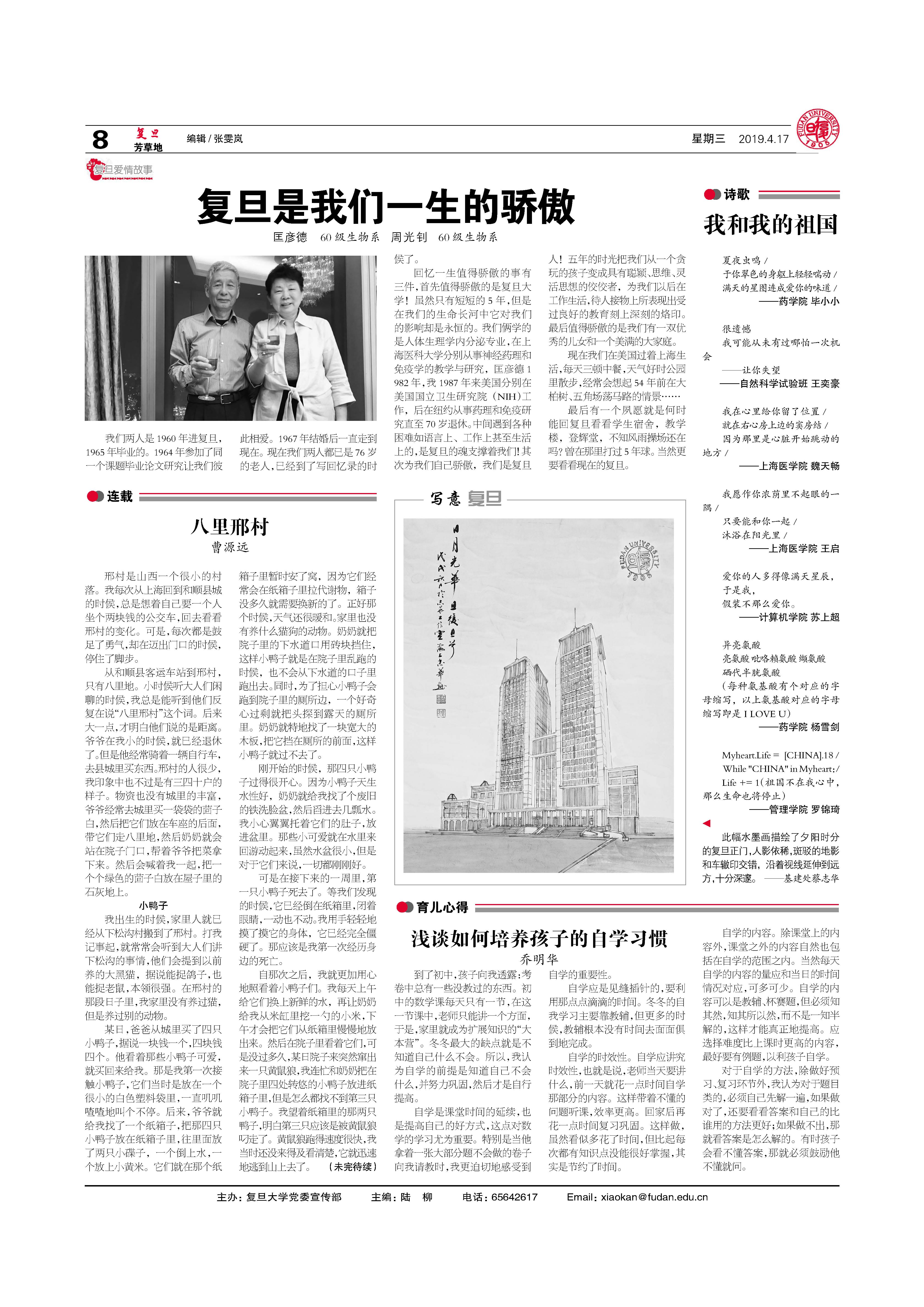 匡彦德60 级生物系周光钊60 级生物系我们两人是1960 年进复旦,1965 年毕业的。1964 年参加了同一个课题毕业论文研究让我们彼此相爱。1967 年结婚后一直走到现在...