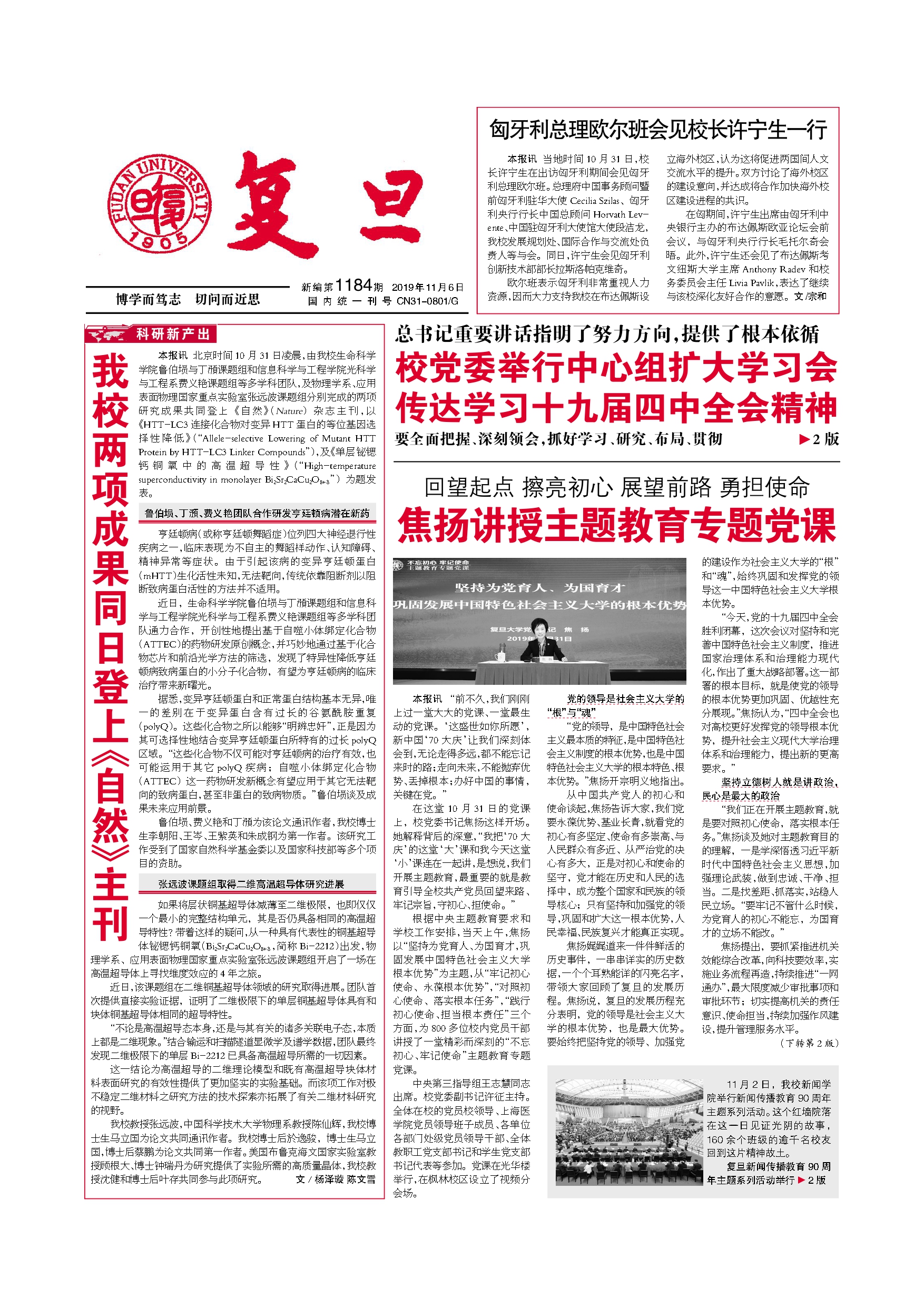 本报讯 11月2日,校党委举行中心组扩大学习会,传达学习党的十九届四中全会精神。校党委书记焦扬主持会议并讲话。她指出,全校要迅速行动起来,把学习宣传贯彻党...