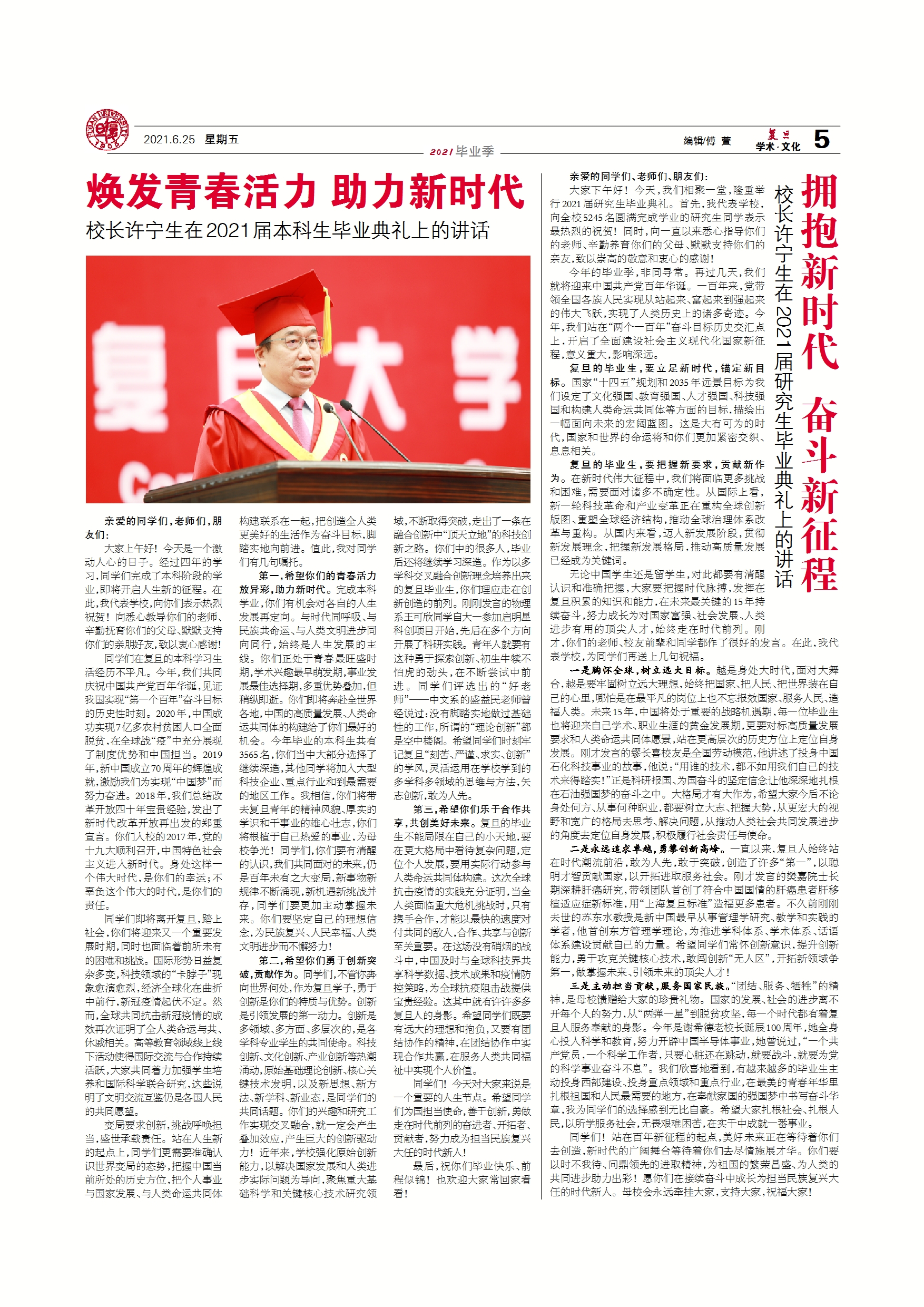 亲爱的同学们、老师们、朋友们:大家下午好!今天,我们相聚一堂,隆重举行2021届研究生毕业典礼。首先,我代表学校,向全校5245名圆满完成学业的研究生同学表示...