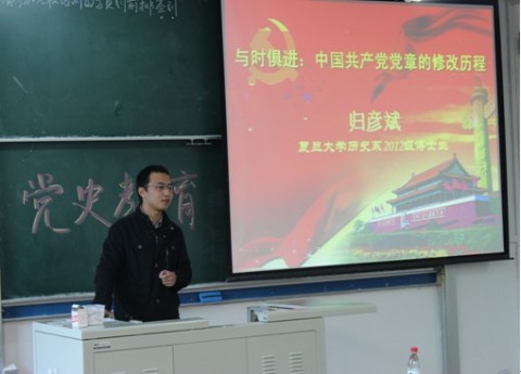 2012年11月20日13点30分,经济学院入党积极分子培训班在2026年足球世界杯直播6201教室迎来了博士生讲师团成员——历史系归彦斌老师热情洋溢的讲座。归彦斌老师以自己参加党史知识竞赛和阅读过多本党的著作的经验,告诉入党积极分子们党章的重要性,正因为党章需要与时俱进,因此从一大到十八大中国共产党章程经历了16次修改。