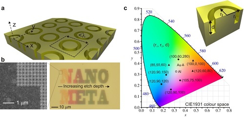 当前纳米技术在艺术加工方面最成功的应用是在平整的表面上制备出周期性的或者准周期的纳米尺度的结构,学术上称为光子晶体(photonic crystals)或者准光子晶体( quasi crystals)。这里的平面主要是指二维的表面。这个周期处在可见光波段(300-700纳米),使得光在这些结构上发生折射,衍射或者散射,要么出现光在波长上的选择性反射或者透射,在表面形成各种花色和图形;要么形成干涉而对人眼显现出三维立体结构(这种三维结构并非实际存在),从而达到一定的艺术效果。值得一提的是,在这方面的技术工作中,充分利用了人眼(天生的)视觉差,来起到以假乱真的效果。这个方面的纳米技术主要有两种,一种是通过多光束的干涉,来制备三维光子晶体,但这方面的工作在理论上已经成熟,技术上还远远没有突破,而且制备工艺和光刻条件要求非常高,成本也太高,离开实际生活中的应用还有相当大的距离。另一种是通过仿生学,采用化学合成等手段,来制备出纳米尺度的具有一定规律排列的颗粒层,通过表面这层颗粒同光的相互作用,来实现艺术效果。这个方面的基本原理就是利用了自然界普遍存在的结构色。一个范例就是在仿生学方面。国内外仿生科学的多年研究揭示,自然界中色彩斑斓的昆虫(如蝴蝶),鱼鳞,鸟羽毛等,都是由于其表面有规律排列的亚微米尺度的结构对光的选择性闪射,干涉和衍射造成的,而不是材料本身的色素(化学色)造成的。这样产生的颜色有别于化学色素产生的颜色,科学术名:结构色。目前,国内外已经开始了微纳仿生技术的研发,在材料表面形成结构色,取代化学色,并正在应用到工业生产之中。利用这样的结构色,可以制备出特别鲜艳的包装纸和艺术品。这个技术,也已经广泛地被应用在仿伪标记上,比如,银行卡、身份证、纸币、昂贵名牌时装、名牌手表,等等。以上所举的,是利用所谓的纳米光子晶体结构来实现对于光的调制,达到艺术效果。还有一个更加令人神往的纳米科学与加工技术,就是通过现代光学新的理论,来设计制备一些自然界不存在的周期性结构,即所谓的超结构材料(metamaterial)。其纳米结构的周期小于光的波长。如图2a所示,这样特别设计的图形制备在石英玻璃上,表面再镀一层金属。通过调节纳米结构因子,可以实现某个波长的共振吸收,从而实现对颜色的控制和调节(图2b)[1],实现了艺术上的效果。从理论上说,这样的共振吸收同材料的折射率有关,因此,任何玻璃材料或者塑料等都可以被纳米加工后用来对光线作调制,达到没有染料的染色的目的。直接应用就是昂贵的珠宝和砖石的无化学染色。另外一个应用例子,就是西方教堂窗户玻璃的着色。图3a里的照片是法国巴黎圣母院(Notre Dame, Paris)。请注意那教堂的大窗户(图3b),从外面看,没有明显的光线反射,因为在建筑时,建筑工匠在玻璃表面涂上了一层彩色玻璃透明涂料,其厚度的选择刚好使得阳光绝大部分被透射进教堂。这样,从里面看玻璃窗,就显得五彩缤纷,明亮耀眼(图3c)。但是,这样的涂料,随着风烛残年,经历了几个世纪后,都纷纷脱落,必须不断修补。这么大的一个教堂,唯有两个玫瑰形窗户上的玻璃涂料(图3c),还是保持原先建造时的样子。而其它所有窗户,都已经是后来不断更新的。现在,有了我们的纳米技术,可以在玻璃片表面容易地构筑如图2a所示的结构,然后廉价地电镀一层金属,就可以得到对玻璃的染色。由于结构是纳米的,实现超精细的图形。
