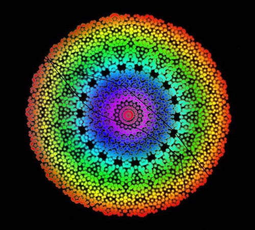 图5. 用电子束光刻在石英上制备的具有准周期特性的准光子晶体。光子晶体的材料是铝。SEM照片是黑白的。彩色是通过PS手法加工而成。其艺术加工的目的就是要表达:这样设计的准光子晶体,实现了对光线按照波长的分离(傅里叶变换)。
