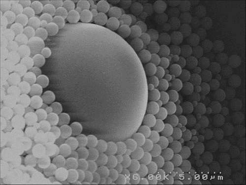 值得一提的是,采用这种特殊手段进行纳米艺术表现是最常见的。它并不要求做出非常精细的纳米结构,往往是通过作者的丰富的想象力,来展现其艺术的一个侧面。举一个具体的例子,图6是在一个硅片表面的一个小水滴蒸发后留下的痕迹。在SEM下,这个小痕迹犹如星球表面被飞来的陨石所击中。