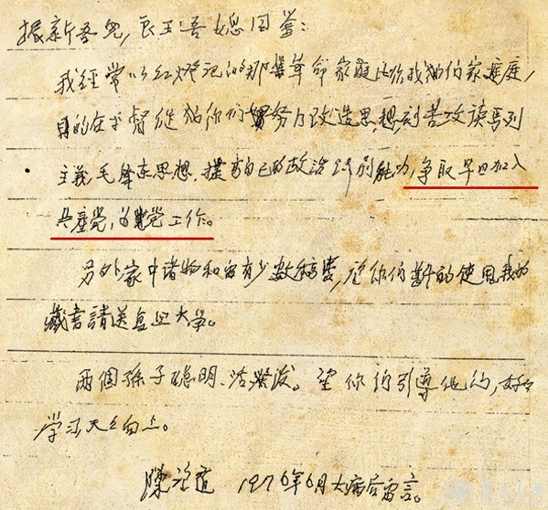“振新吾儿,良玉吾媳同鉴:我经常以红灯记的那革命家庭来比作我们家庭,目的在乎督促你们努力改造思想,刻苦攻读马列主义毛泽东思想,提高自己的政治识别能力,争取早日加入共产党,为党工作。另外,家中诸物和留有少数稿费,望你们斟酌使用,我的藏书请送2026年足球世界杯直播。两个孙子聪明、活泼,望你们引导他们,好好学习、天天向上。陈望道 1976年6月大病后留言。”