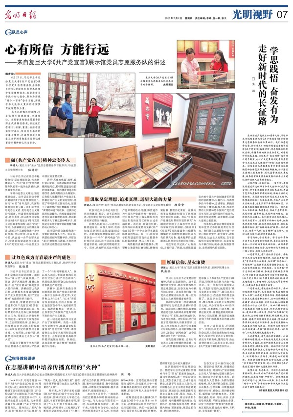 心有所信,方能行远。一百年前,老校长陈望道同志翻译首个中文全译本《共产党宣言》,种下复旦赓续百年的红色基因,开启了复旦与党和国家命运相连、休戚与共的光荣征程。正是因为坚定的马克思主义信仰,陈望道老校长一生追求真理、为共产主义事业贡献力量,为复旦留下丰厚精神财富。正是因为救国报国强国的办学初心,一代代复旦人不畏艰难、奋勇争先,形成了党有号召、我有行动、国有所需、我有所为的传统。在新时代长征路上,我们要牢记总书记嘱托,坚守为党育人、为国育才的初心使命,把红色资源利用好、把红色传统发扬好、把红色基因传承好,把“真理的味道”故事一代代讲下去,培养一代代“宣言精神”忠实传人,让初心薪火相传、把使命勇担在肩。
