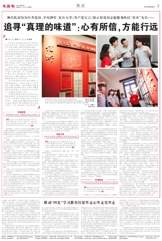 过去两年多来,志愿服务队的年轻人除了利用业余时间在这里做义务讲解员以外,他们还结合专业所学参与研究整理,参与发掘红色资源,先后开发了42门马克思主义理论和党史微课程,为党团支部、师生、社区和各界群众提供“点菜”服务,开展主题宣讲430多场、听众逾1.7万人次。