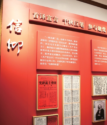 《共产党宣言》展示馆分为两大主题陈设:“宣言中译信仰之源”展示《共产党宣言》的诞生、中译和影响,彰显上海红色起源地的精神与传承;“千秋巨笔 一代宗师”介绍陈望道的生平事迹,勾勒其作为社会活动家、教育家、思想家、学者的光辉人生。