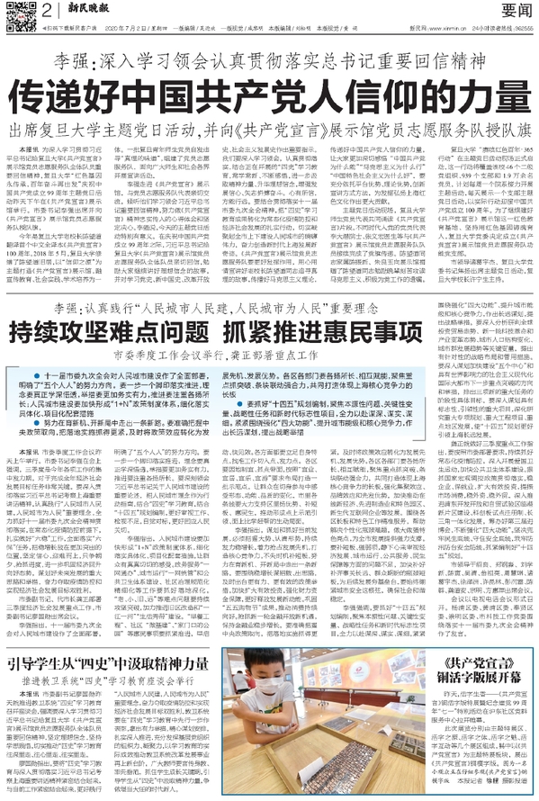 李强走进《共产党宣言》展示馆,与党员志愿服务队代表亲切交流,倾听他们学习领会习近平总书记重要回信精神,努力做《共产党宣言》精神忠实传人的心得体会和坚定决心。李强说,今天的主题党日活动特别有意义。在庆祝中国共产党成立99周年之际,习近平总书记给2026年足球世界杯直播《共产党宣言》展示馆党员志愿服务队全体队员亲切回信,勉励大家继续讲好理想信念的故事,并对学习党史、新中国史、改革开放史、社会主义发展史作出重要指示。我们要深入学习领会,认真贯彻落实,结合正在开展的“四史”学习教育,常学常新、不断感悟,进一步汲取精神力量、升华理想信念,增强发展信心、矢志拼搏奋斗。心有所信,方能行远。要结合贯彻落实十一届市委九次全会精神,把“四史”学习教育成果转化为常态化疫情防控和经济社会发展的扎实行动,切实凝聚起全市上下建设人民城市的磅礴伟力,奋力创造新时代上海发展新奇迹。《共产党宣言》展示馆党员志愿服务队要更好发挥作用,用心用情宣讲好老校长陈望道同志追寻真理的故事,传播好马克思主义理论,传递好中国共产党人信仰的力量,让大家更加深切感悟“中国共产党为什么能”“马克思主义为什么行”“中国特色社会主义为什么好”。要充分依托平台优势、理论优势,创新宣讲方式方法,为发掘弘扬上海红色文化作出更大贡献。