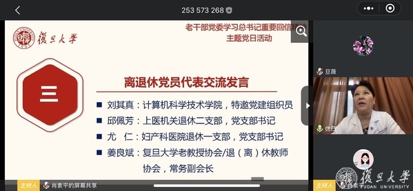 老干部党委副书记、退休教职工工作处处长周桂发回忆了在档案馆工作期间为入党积极分子、新进师生等宣讲党史、校史的经历和感悟,并在总结中指出离退休党支部要在学校党委启动的“赓续红色百年·365行动”中积极展示退而不休、奋发有为的精神风貌,离退休党员要进一步在“四史”学习教育和三全育人工作中发挥独特优势作用,在关心教育下一代的过程中将复旦精神和红色基因更好得传承下去。