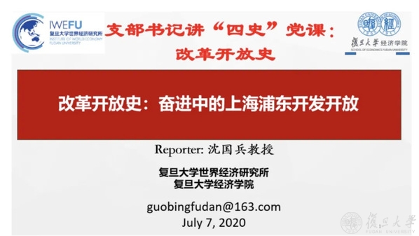 扎实推进“四史”学习教育,世界经济学党支部开展主题党日活动,支部书记沈国兵教授围绕“改革开放史:奋进中的上海浦东开发开放”作专题党课。