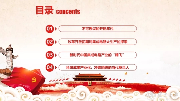 在当天主题党日活动中,支部各调研小组负责人分别以“不可思议的开拓年代”“改革开放初期对集成电路大生产的探索”“新时代中国集成电路产业的‘腾飞’”“科研成果产业化:冲锋陷阵的当代复旦人”为主题分享了调研成果。