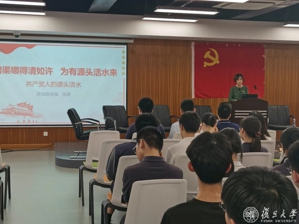 支部党员、高三政治备课组长张燕老师作 “感召·呼唤·引领”主题发言。她分享了陈望道老校长翻译《共产党宣言》首个中文全译本的经历,告诉同学们真理和信仰是力量之源,并鼓励他们开拓视野,知史爱国,学会历史思维,增强使命担当。