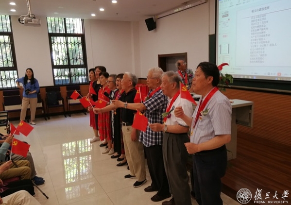 生命科学学院退休教职工党员中,党龄50年以上的老党员有34位,其中21位参与了本次活动。在鲜红党旗下,他们佩戴党徽,别上胸花,118老年合唱队为老党员们献上一首《唱支山歌给党听》,老党员陈永青领衔并引领全场高声合唱。