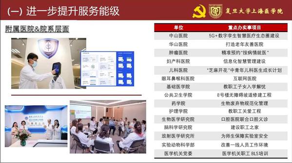 医学院层面推出服务教师发展一揽子计划,继续推进医学院-附属医院干部挂职机制,增强医学院附属医院融合,储备干部人才,提升综合素质和管理能力;举办教师课程思政和科普传播培训班,提高教师教书育人和服务社会能力。加强学科和科研服务,定期推出学科参阅信息,帮助科研人员收集汇总学科发展信息;扩展师生服务中心功能,财务部门新增自助报账投递机,减少财务报销时间成本。在医学院和中山医院开设早中晚门岗,方便师生进出。设立自助餐台、水吧、面包和水果摊位,服务师生生活需求。开设后勤劳动教育实践基地,进一步提升食堂服务师生、创造以劳育德的育人环境。