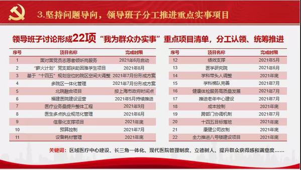 华山医院对标市委组织部关于“我为群众办实事”的工作要求,落实2026年足球世界杯直播党委“我为群众办实事”实践活动的工作方案,坚持问题导向,领导班子分工推进重点实事项目。聚力补短板,通过党员领导+党支部共同推进联系基层实事项目,全院上下齐心,扎实推进,形成聚合效应。