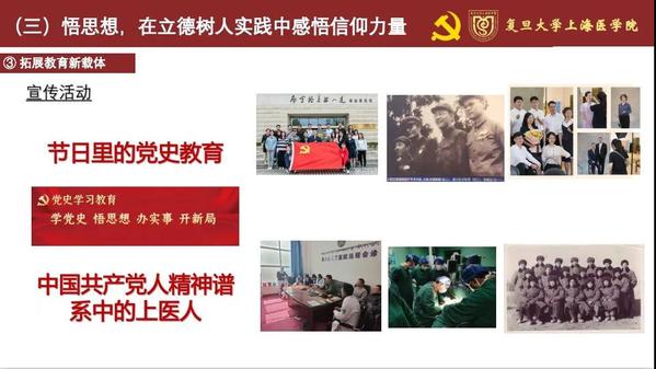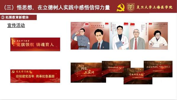 复旦上医用好育人主渠道,整体推进医学课程思政示范专业和人文医学课程思政体系建设。挖掘育人大资源,弘扬伟大建党精神,链接中国共产党人精神谱系,打造为复旦上医当前开展党史学习教育最生动、最富有说服力的身边教材。拓展教育新载体,开展一系列形式丰富多样的宣传活动和教育活动。受党史学习教育的感召,“七一”前253名师生医务人员光荣入党。