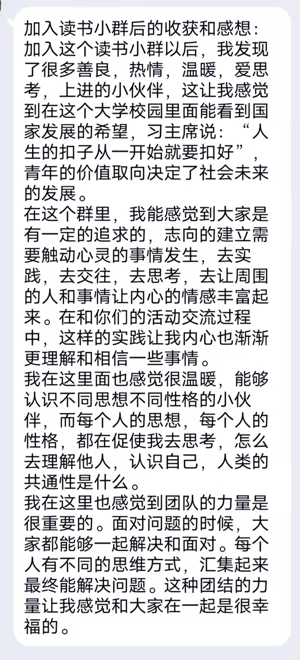 2021级法学院本科生王明庆则在一个线上读书交流群中体验到了别样的趣味。读书群是由复旦学生自发形成的,来自工科、技科、中文、医学、生物工程等各个专业的同学共读《资治通鉴》《1844年经济学哲学手稿》《爱的艺术》等作品。据王明庆介绍,群里定期还有打卡活动,这种新颖的形式既能够促进同学间的相互交流,也可以督促自己每天读书。此外,一些相互“眼熟”的同学还有一个小群,除了专门的交流和讨论之外,群友间也经常分享日常的生活触动,与书籍文本相互映照。隔着屏幕,他们反而更坦然、包容地与彼此建立起了联系。“在这里我感觉很温暖,每个小伙伴的思想、性格,都在促使我去思考人类的共通性是什么。”一位群友分享道,“志向的建立需要触动心灵的事情发生。去实践,去交往,去思考,去让周围的人和事情让内心的情感丰富起来。”