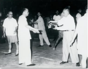 1958 年 8 月18日,校长陈望道(右捧书者)与教职员工一起参加义务搬书活动(供图:档案馆)