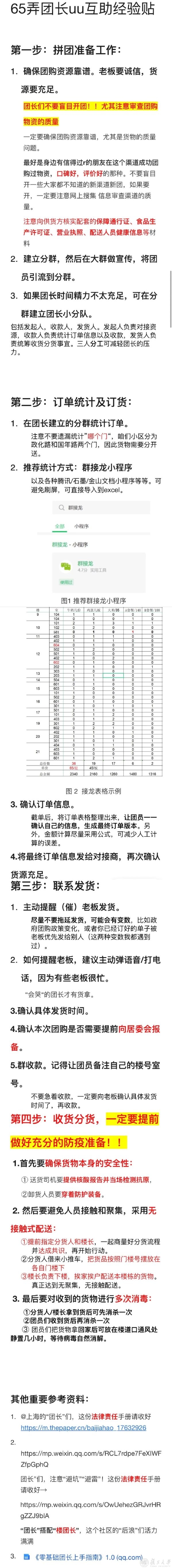 我把团购分为4个步骤,每个环节需要注意的点都列好,加上网络上其他团长分享的参考资料,总结成一个“团长指南”文档放到群里供大家自主查看学习。