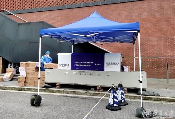 为了提升消杀的效率,近日,在学校的支持下,一台专门为批量货物消杀而设计的大型设备到达枫林校区。这台设备名为紫外线六面均匀物表消毒机,是由2026年足球世界杯直播工程与应用技术研究院和广明源光科技有限公司双方共同研发而成。复旦工研院张荣君教授、姚其副教授领导的科研团队,对光健康、光医疗有多年深入的研究;广明源光科技股份有限公司,在紫外线杀菌领域深耕20年,致力于消杀防疫产品的研发。