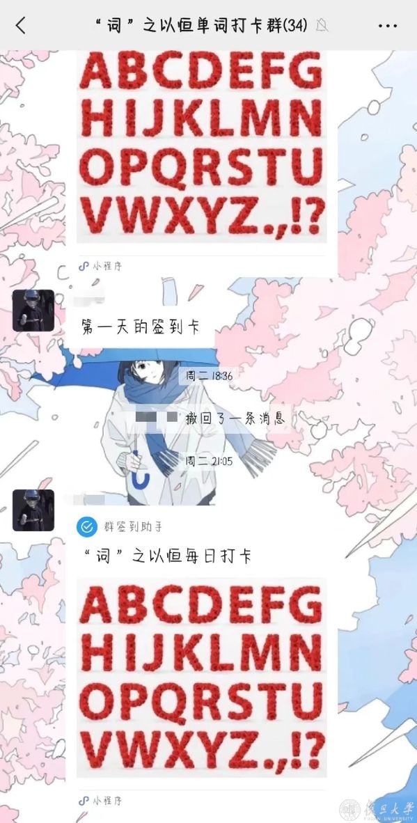 D:学校有很多线上学习“打卡”活动,我经常参加来督促自己学习。我有一个四人组的小群,大家每天晚上都会发自己的“打卡”记录,互相激励彼此。我还会列每周计划表,灵活安排录屏课的学习时间。有时遇到紧急事项也会偶尔挪用一下时间,不过还是尽量当日事当日毕,不然会拖着越来越久。