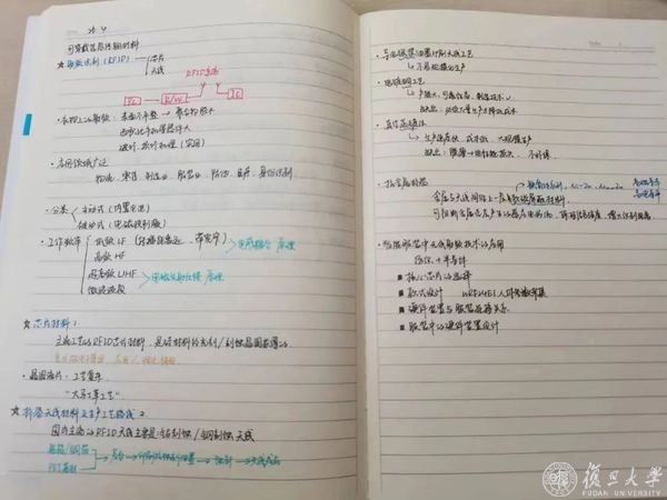 B:与大多数自律的同学们不太一样,网课笔记对我来说更多源于一种习惯。我在日常生活中就喜欢拿笔记一些零零散散的东西,这种习惯放到课堂上,比较好的一点是,老师讲到某一点,我会联想到过往知识点,所以我除了记录课堂笔记外也会把联想到的知识点一并写下。翻开我的笔记,你会发现,重要的公式、思维导图、感悟随笔到处都是,可以说是“不太像笔记的笔记”。这种习惯也会使我在课后把一些逻辑性很强的课程,通过整理零散内容的方式来进行自我梳理,比如英语、智能可穿戴材料、模拟与数字电子线路等课程。