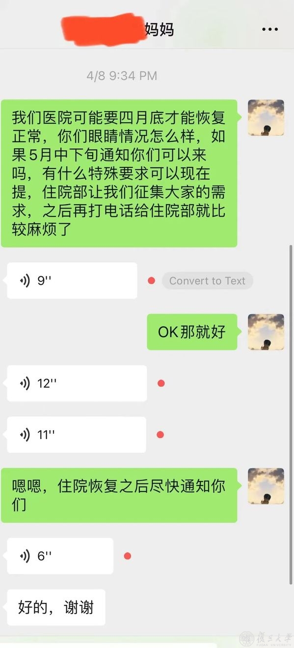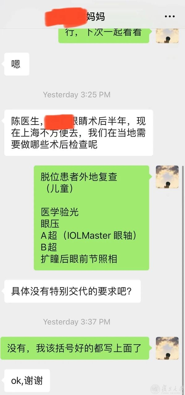 埋头科研之余,陈泽旭也不忘服务人群,为更多人提供力所能及的帮助。陈泽旭在眼耳鼻喉科医院进行临床实习,不少随访病人都加了微信,方便联系。疫情防控期间,经常会有病人来向他咨询,无论问题多琐碎,他都一一耐心解答,“孩子眼睛术后半年,现在不方便来上海,我们在当地可以做哪些检查?”有患者妈妈来咨询。对于不少像这样身处外地暂时无法来沪的随访患者,陈泽旭都会一项项列明复查项目清单,请他们按照清单先在当地医院复查,并且远程为患者解读复查报告。对于恢复住院后可能将入住的患者,陈泽旭也会提前和患者沟通,排摸需求。虽然疫情隔开了医患的距离,但线上的关切和问候让医患联系不断线。“其实不管是不是疫情期间,我们都会尽力解答患者的每一个问题。而在这个特殊时期的一份耐心,更能让焦急的患者感到安心。”