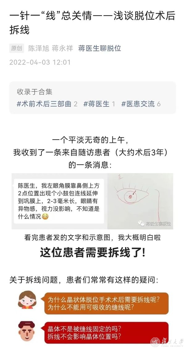 利用这段时间,陈泽旭还撰写了科普推文,“之前有很多患者会反复询问术后拆线的问题,一直想整理一篇科普文章,之前已经把照片资料收集好了,框架也搭好了,最近正好有时间就一鼓作气成文了。”推文中,他深入浅出地解释了眼科手术术后拆线的原理,以及术后如何恢复、适应的注意事项,解答了很多患者的疑问。