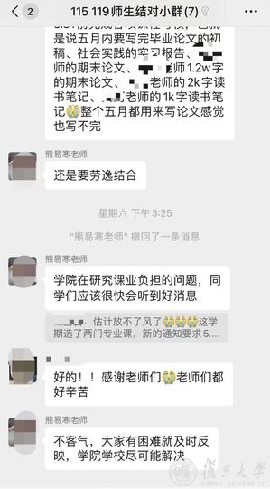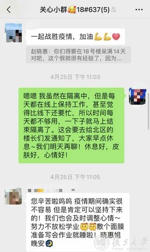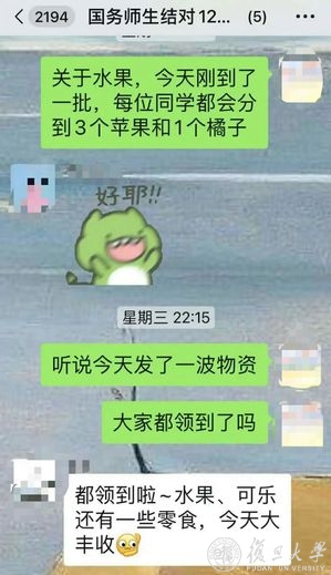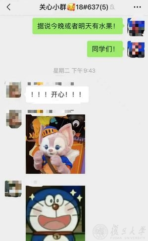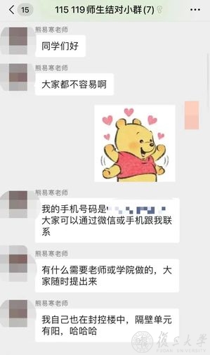 这时,学院启动针对18号楼的导师关爱行动,两天内集结一支包括24名国务学院教师的志愿者队伍,以一对多的形式开展云端关怀。答疑解惑、传达意见、协调物资、心理疏导……来自导师们的满满关爱,让包蕴颖她们的封控生活变得不一样了。
