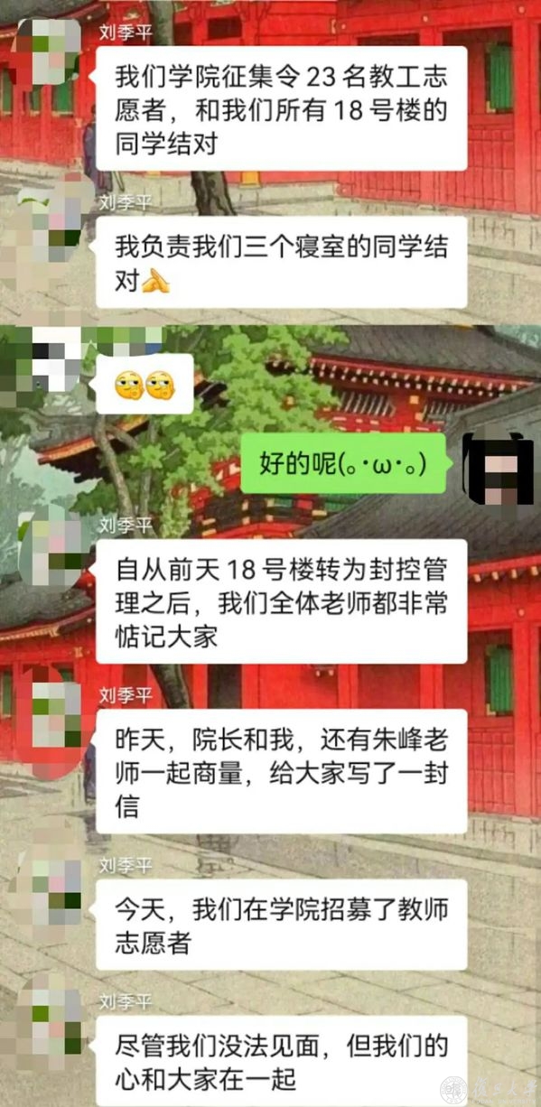 之前院系奖学金评选时,包蕴颖曾聆听刘季平老师讲述就读复旦本科时的逸闻趣事,被他的和蔼可亲、平易近人打动。封控在楼内,在微信群里交流,更加感受到刘季平的亲切幽默。