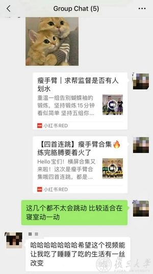 政治学系的吴洁老师在与三位2019级非本专业同学结对过程中,注重心理疏导与情绪支持。“考虑到18号楼此前经历过一次封控,封闭在小空间内很不容易,我会给他们推荐一些不太会影响楼下同学的健身活动、娱乐活动,比如刘畊宏《本草纲目》,来为他们放松心情。”