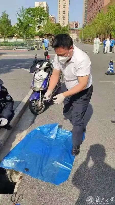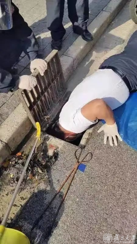 本来也只是抱着试试看的心态等待老师们的帮助,却在一小时后拿到志愿者送来的校园卡以及看到路人拍摄的照片,那一刻我瞬间破了防:宽度不足半米、一眼望不到底的窨井,一位安保人员愣是在这样的条件下趴在地上,探进半个身子徒手将我的校园卡捞出。后来我知道他就是负责西苑保安队的郭队长。我原想着,老师们帮忙用钳子打捞已是实属不易,却不曾料想在疫情之下,有人这样千方百计地俯身为我捞出校园卡。