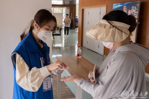 身穿复旦蓝的青年志愿者举着喇叭,引导着做核酸的人保持安全距离,扫码、检测。一抹中国红,穿梭在宿舍楼之间:党员服务队的脚步从未停歇。