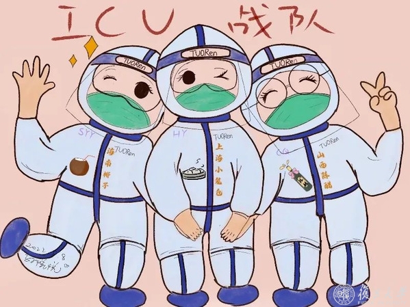 在宝山院区定点医院,因为常常能看到画着“山西陈醋”“海南椰子”和“上海小笼包”等的防护服一起出现在病区,ICU护士孙悦悦花了8个小时手绘了一幅“ICU战队”。来自天南海北的“90后”“00后”姑娘们,用最纯真的笔触留下了最美好的真诚情谊与时光记忆。