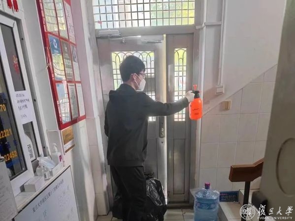 董宇泽还对所在楼宇的一楼大门附近等公共区域进行消毒,尤其同学们接触比较多的地方,如对扶手、进出门按钮等地方进行擦拭消毒。每天他还用消毒喷壶给一楼大厅消消毒,然后再拖一遍地。“这是我们平时发物资的地方,所以就多加费心一点。”