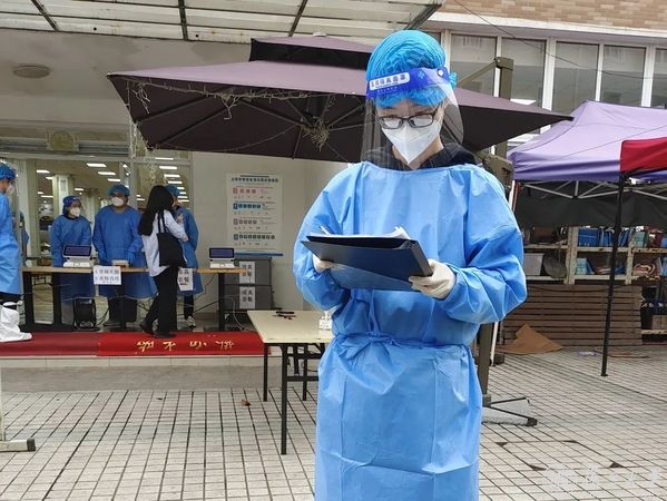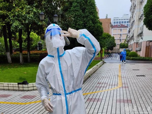 第二天一早,她先在群里确认好志愿者们的抗原结果,确保没问题之后,通知志愿者们到其所在的楼宇,在楼宇门口把防护服、面罩、手套等发给大家,告知他们穿的顺序、需要注意的细节,协助他们穿好并再三检查是否穿戴妥当。准备就绪后,范佳晨将志愿工作证发放到每位志愿者的手中。
