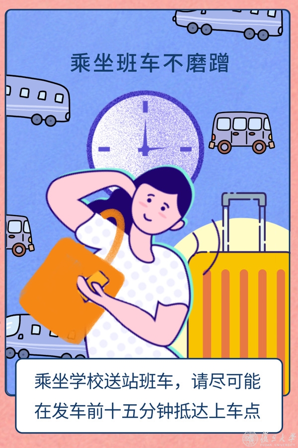 C:我坐的是早晨五点的学校班车,大约四十分钟不到就到虹桥站。目前学校提供离校返乡送站服务,同学们完成离校手续后,可以线上提前预约。大家乘坐学校班车,尽可能提前十五分钟抵达上车点(因为出发前还需要花时间核验相关证明),否则会延误班车整体行程。