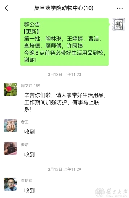 3月13日,校园面临准封闭,急需专业人员进校保障实验动物饲养及保障。接到通知的第一时间,动物中心全体老师就紧急动了起来:迅速确定基本需求、排摸人员情况、确定名单、通知到位、筹措物资、迅速集结。从通知下来到人员到位,仅用半天时间。