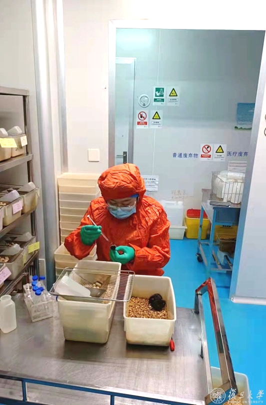 为保科研不停步,这么多天以来,来自学院动物中心的王婷婷,每天上午10时,都会准时对这一批C57小鼠进行观察与实验。按需完成20多只小鼠的配药、给药,已经是1个小时之后,她又转身马不停蹄地开始处理其他实验委托。