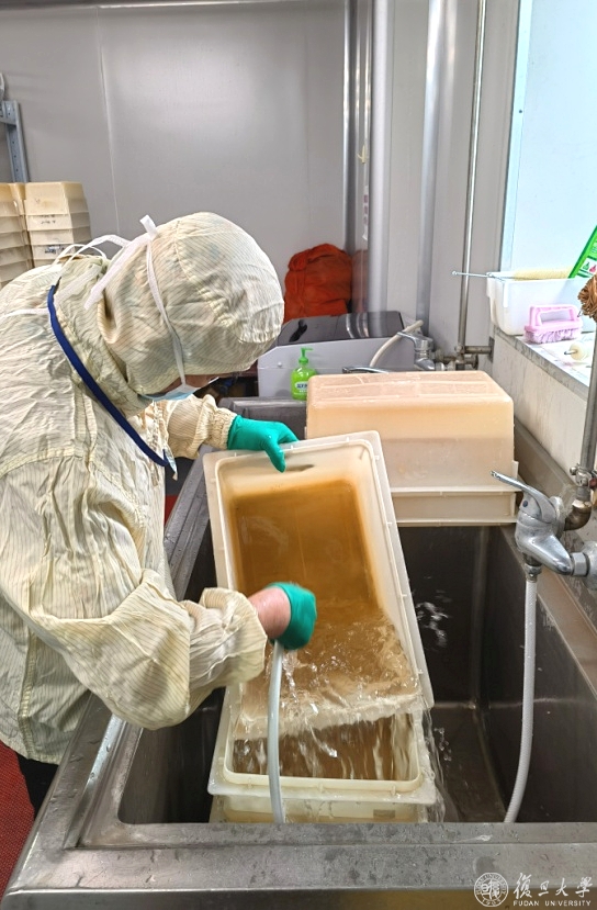 顾师傅、许阿姨都是退休返聘的老同志,如今他们成为实验动物的守护者。定期更换鼠笼、倾倒脏垫料、清洗笼具……两位老同志承担了动物饲养工作较为繁重的环节,好在他们在守护动物的同时,有更多人在守护他们——其他同事常常热心跑来帮助分担部分笼具清洗的工作,加快整体工作的进度;通过学校“生命通道”的支持,顾师傅、许阿姨所需的相关药品也能顺利进校,解决了后顾之忧。