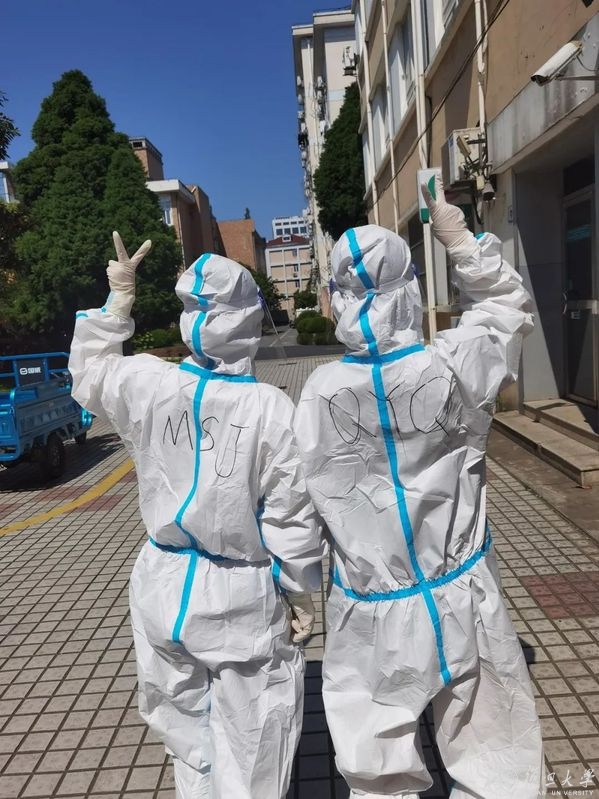 当天早晨,马思嘉换上全套的“小蓝”防护装备,冒雨外出工作。在一个岔路口,马思嘉看到负责当天南区返乡同学核酸加测的信息科学与工程学院副书记陈睿身穿“大白”防护服,背着一袋核酸检测物资,与医护人员一起向检测点跑去。