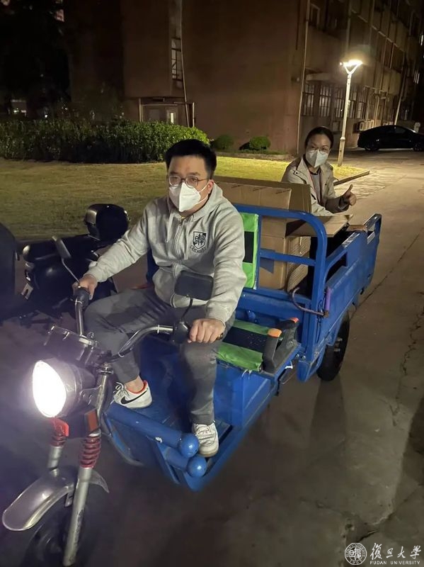 每天都有堆成小山的防疫物资、食品、生活用品等,需要运送分发给南区50多栋宿舍楼。马思嘉和同事穿好防护服,开上三轮车,一趟又一趟地把物资运送到各栋宿舍楼。他们不仅为志愿者减轻负担,也在夏夜晚风轻拂中,消解身心的疲惫。