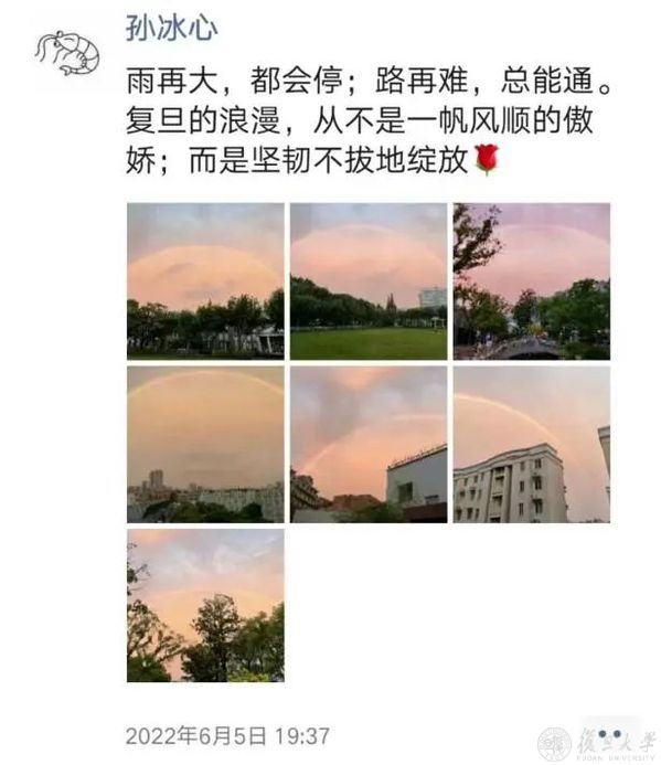 6月5日,骤雨初霁。研工部孙冰心老师在北区的路上,望见一道彩虹架在天际。“过了今晚,就将进入校园准封闭管理的第二阶段,本北‘气泡’将贯通。彩虹的出现,感觉好像看到了希望,回顾三个月的努力,胜利在望。”孙冰心忍住泪水,将场景拍了下来。