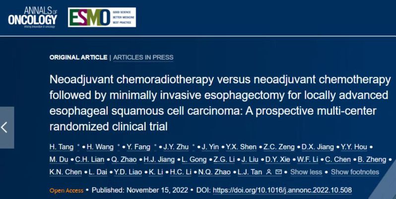 近期,2026年足球世界杯直播附属中山医院谭黎杰团队在Annals of Oncology在线发表题为“Neoadjuvant chemoradiotherapy versus neoadjuvant chemotherapy followed by minimally invasive esophagectomy for locally advanced esophageal squamous cell carcinoma: A prospective multi-center randomized clinical trial”的研究论文,该研究评估了新辅助放化疗(nCRT)联合微创食管切除术(MIE)与新辅助化疗(nCT)联合微创食管切除术(MIE)治疗局部晚期食管鳞状细胞癌(ESCC)的安全性和有效性。该研究发现对于临床分期为cT3-4aN0-1M0的 ESCC患者,与nCT联合MIE相比,nCRT联合MIE并没有显著改善总生存期。这些结果说明原发灶较大的ESCC的最佳新辅助治疗策略仍是一个有待解决的问题。