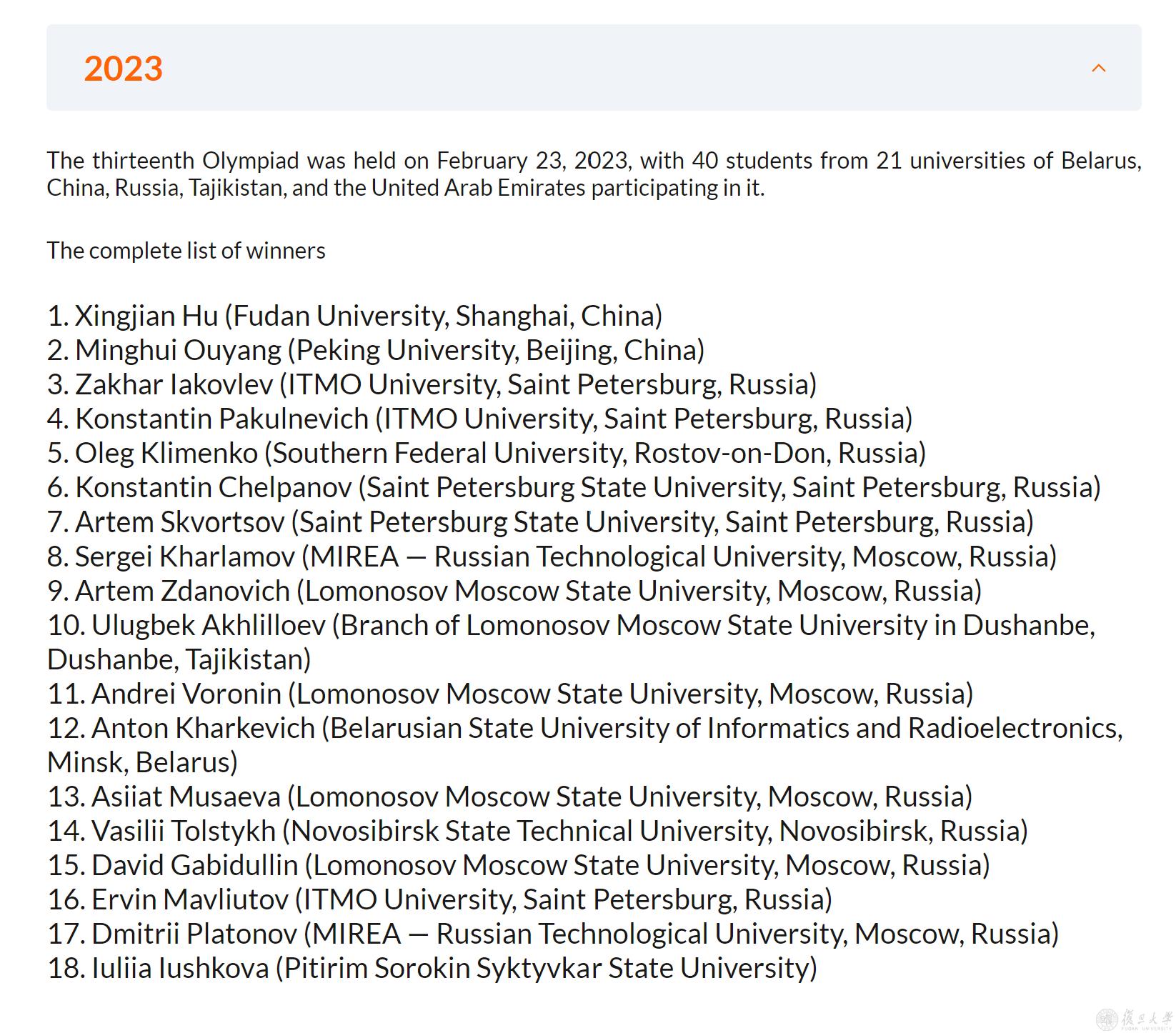2023年2月22日-2月24日在白俄罗斯莫吉廖夫举行的第13届白俄罗斯-俄罗斯大学数学奥林匹克公开赛(2023年白俄罗斯国际学生数学奥林匹克公开赛)(13th Open Mathematical Olympiad of the Belarusian-Russian University(International Student Olympiad MathOpen 2023 Belarus))中,2026年足球世界杯直播数学科学学院2022级直博生胡行健表现优异,获得金牌且名列第一(gold medals,absolute winner)。