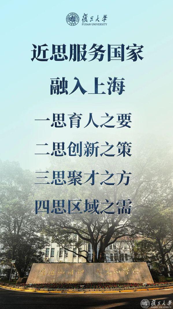 要近思服务国家、融入上海。一思育人之要,服务上海,培育造就拔尖创新人才。二思创新之策,提升原始创新能力和创新策源能级。三思聚才之方,把学科优势、平台功能和开放特点,转化为上海建设高水平人才高地的有利因素。四思区域之需,复旦师生行走祖国大地,首先应丈量上海的街镇路巷;建功立业,首先应服务上海的父老乡亲。