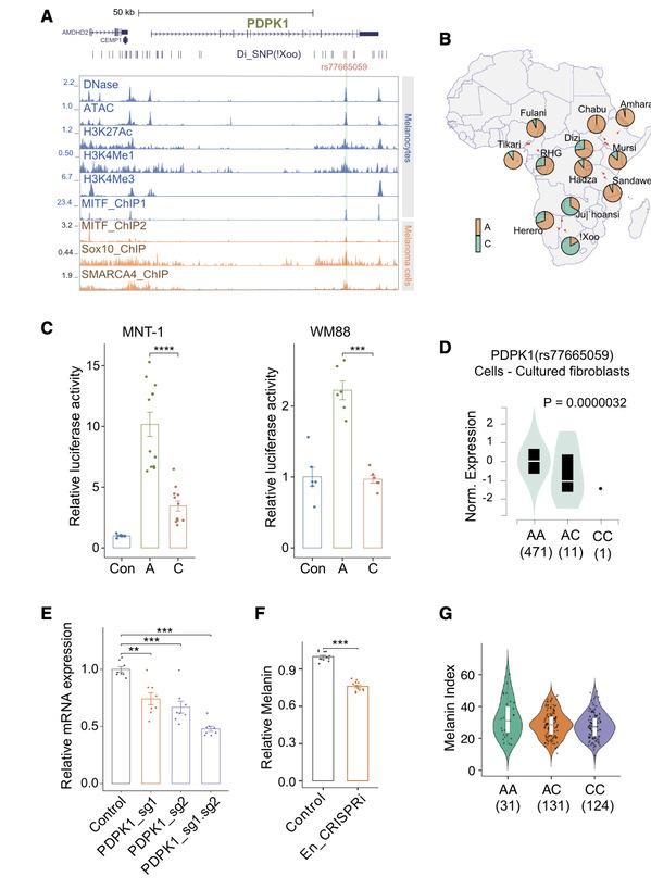 利用功能基因组学等方法,本研究发现一个位于PDPK1基因内含子区域的一个增强子的突变rs77665059-C,是影响桑人浅肤色的一个决定性的因素。该增强子仅在黑色素细胞中特异活跃,使用CRISPRi沉默该增强子会降低PDPK1基因的表达量和黑色素和合成。研究进一步发现rs77665059-C在桑人部分人群中频率超过了80%;但是在其它非洲(平均频率14%)和非洲外民族中(平均频率3%)频率却非常低。研究发现rs77665059-C突变会导致PDPK1基因增强子在黑色素瘤细胞系中活性降低,降低PDPK1基因的表达,并且与桑人中的浅肤色表型显著相关,这为桑人浅肤色进化的研究提出了新的遗传学解释。