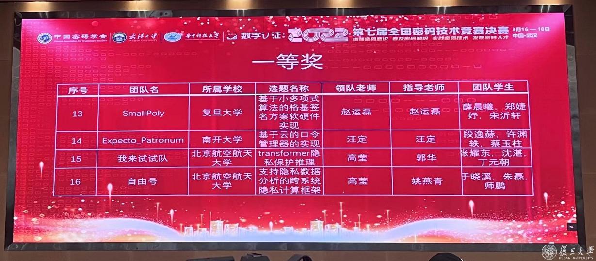 密码是保障网络空间和信息化安全的核心技术,是国之重器。通过组织学生参加密码竞赛,进一步增强了学生注重密码与信息安全的意识,锻炼了学生解决问题的思考分析能力。同时,也提高了学生的实践能力和团队合作能力。未来,复旦密码技术团队会再接再厉,力争再创佳绩!