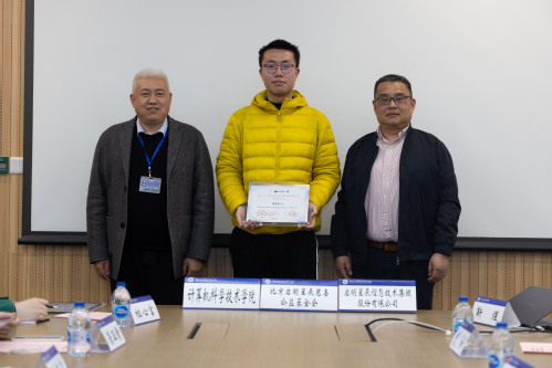 随后,孙涛副总裁和王新书记为获奖学生颁奖。博士生徐际岚代表获奖学生发言,汇报了自己的学习科研近况和取得的成果。他的研究聚焦于研究多模态(主要集中在计算机视觉和自然语言处理)方向以及医学影像领域的研究,在相关领域的国际会议上发表多篇论文。他对于启明星辰在我院设立奖学金深表感谢,表示以获得启明星辰奖学金作为新的起点,踏实前行。